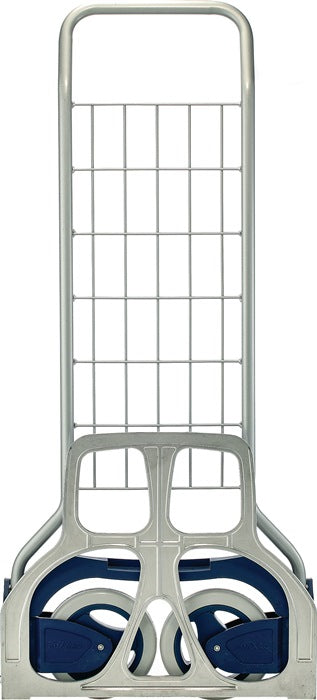 Wózek na paczki ze składaną aluminiową łopatą - malowana proszkowo stalowa rama ze zintegrowaną siatką stabilizującą ładunek - siatka między prętami zapobiega prześlizgiwaniu się ładunku - ścięta powierzchnia uchwytu pręta dla bezpiecznego prowadzenia - koła z łożyskami rolkowymi i oponami polimerowymi