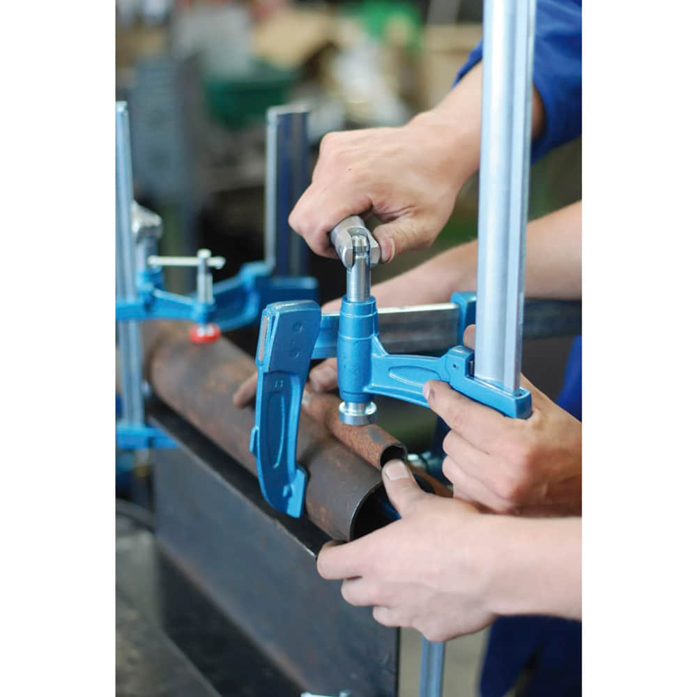Wysokowydajny zacisk śrubowy z łożyskiem kulkowym w obudowie kapsułkowej - Składany metalowy uchwyt - Gwintowana obudowa chroni wrzeciono przed punktami spawania i uszkodzeniami - Specjalne zalety produktu: - Siła docisku do 12000 N - ok. 60 % większa siła docisku przy takim samym nakładzie pracy w porównaniu ze standardowym dociskiem - Obrabiane elementy mogą być mocowane również na krawędzi tarczy dociskowej