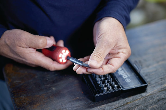 - Rękojeść wkrętaka speedE® PocketDrive, 31-częściowy zestaw bitów z rowkiem płaskim, krzyżakowym, Pozidriv, sześciokątnym, TORX®, magnetyczny uchwyt na bity, kabel USB do ładowania (typ USB-C), softbox