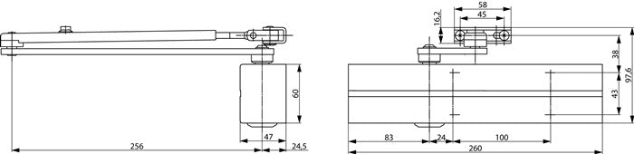 geprüft nach DIN EN 1154 · mit integrierbarer Montageplatte für Feuer- und Rauchschutztüren verwendbar · max. Höhenausgleich stufenlos 14 mm · Schließkraft stufenlos einstellbar Schließgeschwindigkeit · Endschlag und Öffnungsdämpfung stufenlos von vorne einstellbar · DIN links und DIN rechts verwendbar · Maße: (B x H x T) 260 x 60 x 47 mm · Lieferung ohne Gestänge - Bitte separat bestellen