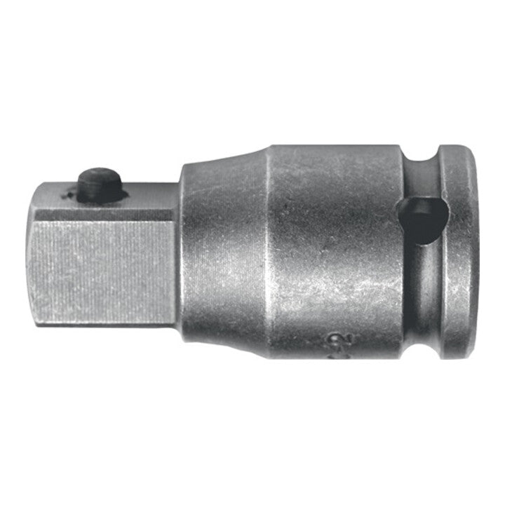 Antrieb: 12,5 mm (1/2 ″)-Vierkant DIN 3121 · Form G 12,5 · mit Stiftbohrung und Ringnut Abtrieb: 10,0 mm (3/8 ″)-Vierkant DIN 3121 mit federndem Stift · aus Sonderstahl · Oberfläche stahlgrau · geölt · für härteste Beanspruchung auf Elektro- und/oder Druckluft-Schlagschraubern
