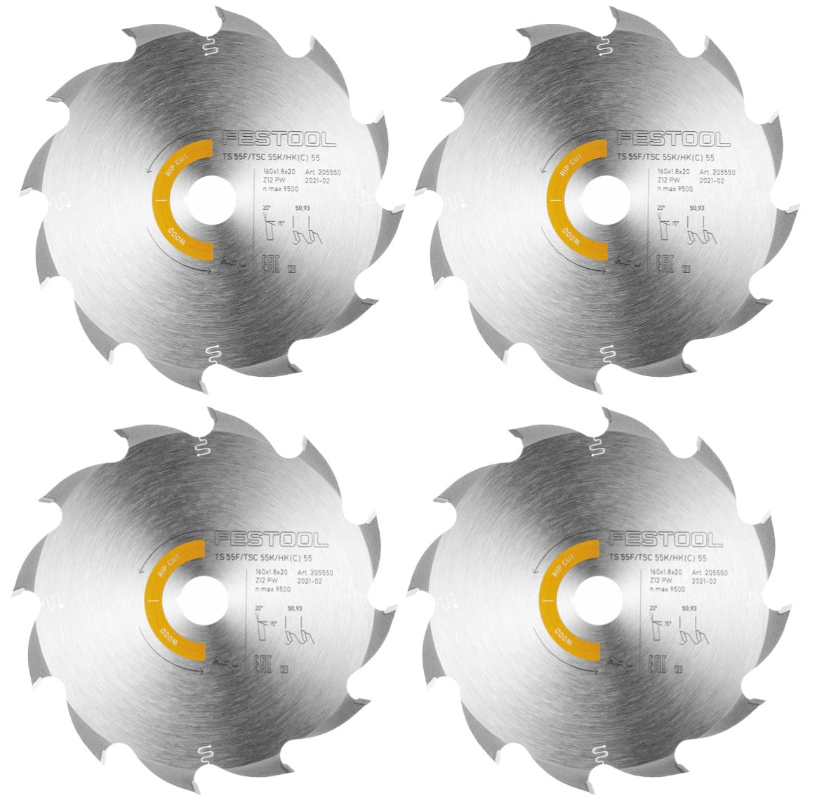 Festool 4x Kreissägeblatt Wood Rip Cut HW 160 x 1,8 x 20 mm PW12 ( 4x 205550 ) für Tauchsägen TS 55 F, TSC 55 K & Handkreissägen HK 55, HKC 55