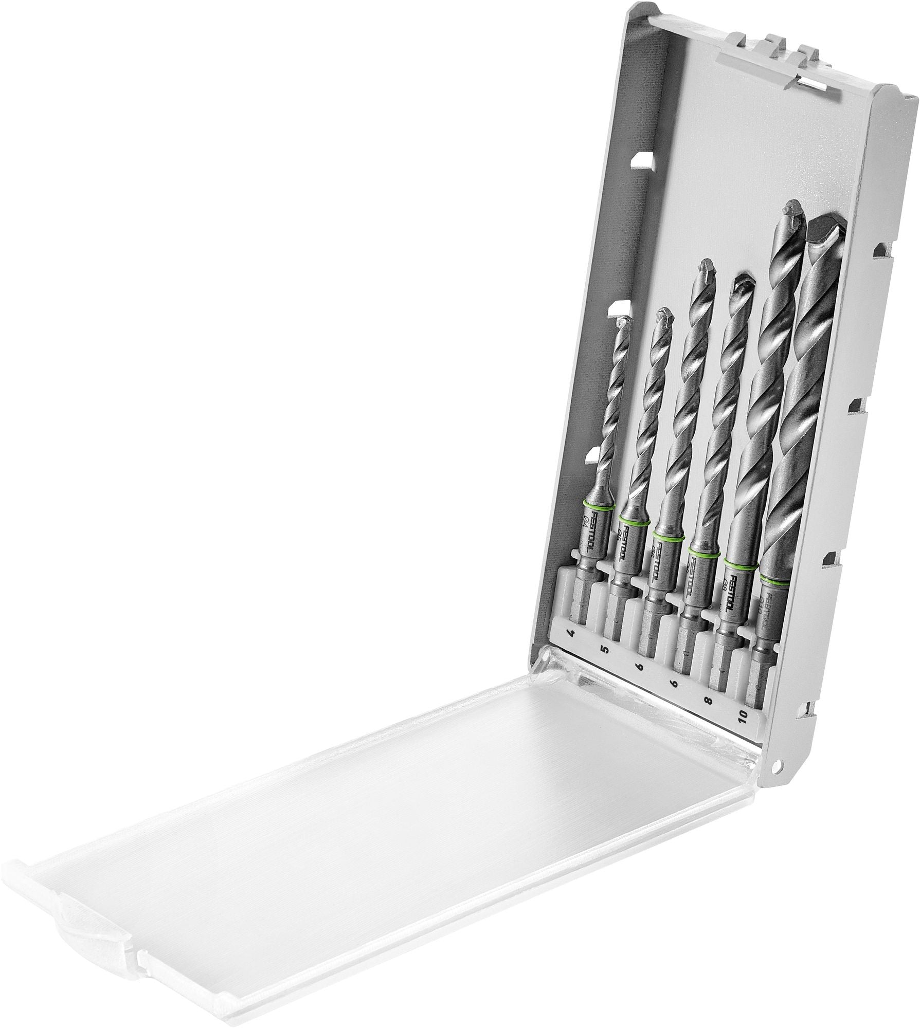In der praktischen Deckelfachkassette sind 6 hochwertige Steinbohrer immer sauber verstaut und schnellstens griffbereit. Die Bohrerkassette kann entweder im Deckelfachsystainer oder auch als separate Box verwendet werden. Durch die integrierten Magnete werden die Bohrer sicher gehalten und ermöglichen ein komfortables Herausnehmen sowie Verstauen der Bohrer. Die Steinbohrer können direkt in das CENTROTEC Werkzeugfutter eingesetzt und verriegelt werden. Die CENTROTEC-Aufnahme ermöglicht schnelles und bequemes Wechseln der Bohr- und Schraubwerkzeuge.