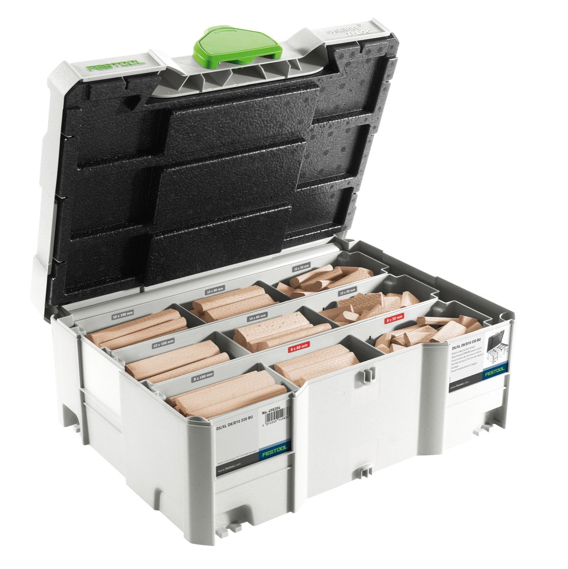 Das Festool Domino Dübel Sortiment besteht aus 306 Domino Dübeln in verschiedenen Größen. Die Dübel sind aus massivem Hartholz gefertigt, wodurch stabile und kraftschlüssige Verbindungen ermöglicht werden. Die Domino Dübel vereinen die Vorteile von runden und flachen Dübeln, durch die quellenden Leimtaschen und seitlichen Längsrippen wird eine optimale Passgenauigkeit erreicht. Die Verbindungen sind absolut verdrehsicher ab dem ersten Dübel. Die mitgelieferten Domino XL Fräser für die Größen 8 und 10 ermöglichen exakte Dübelfräsungen für die Domino Dübel.