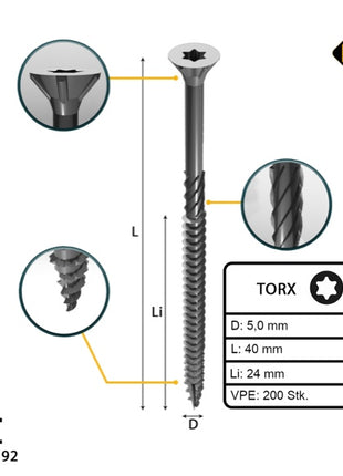 - 200x FORTE Tools Universal Holzschraube 5,0 x 40 mm T25