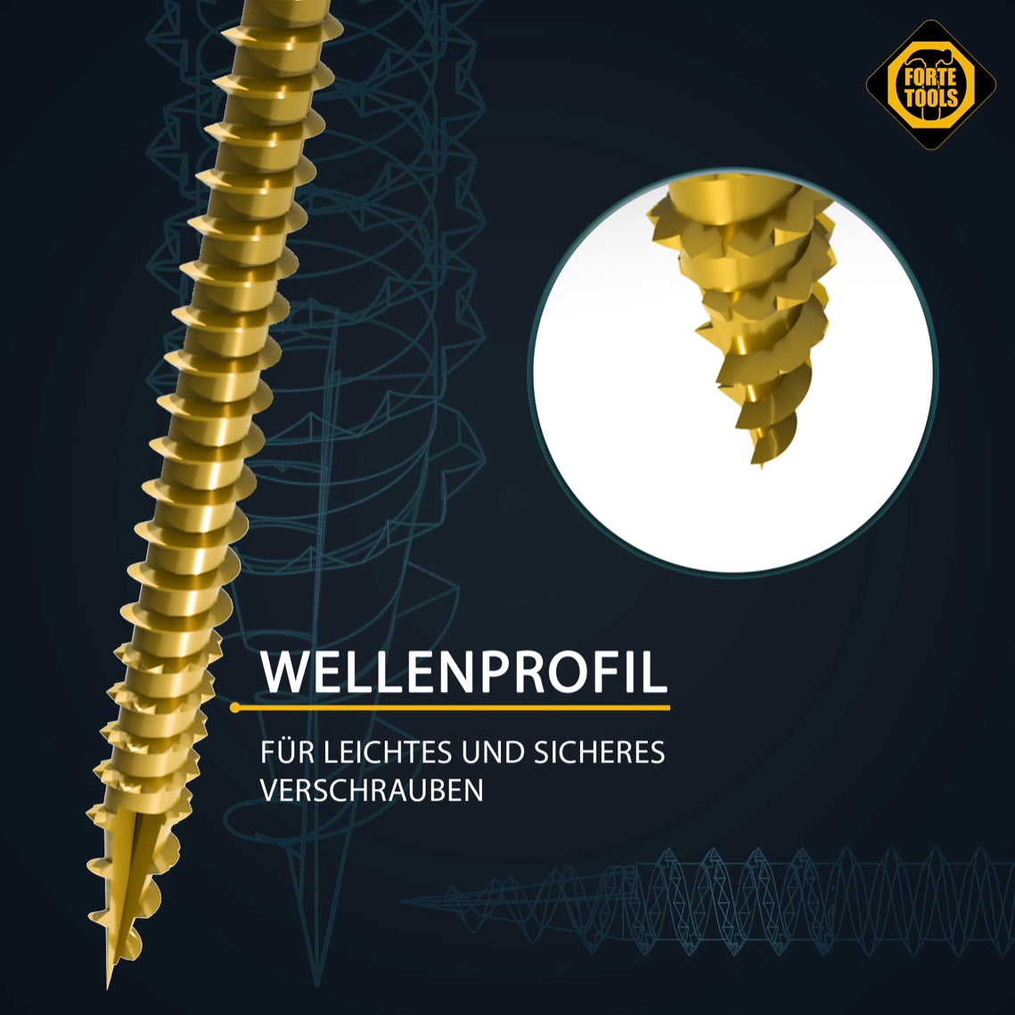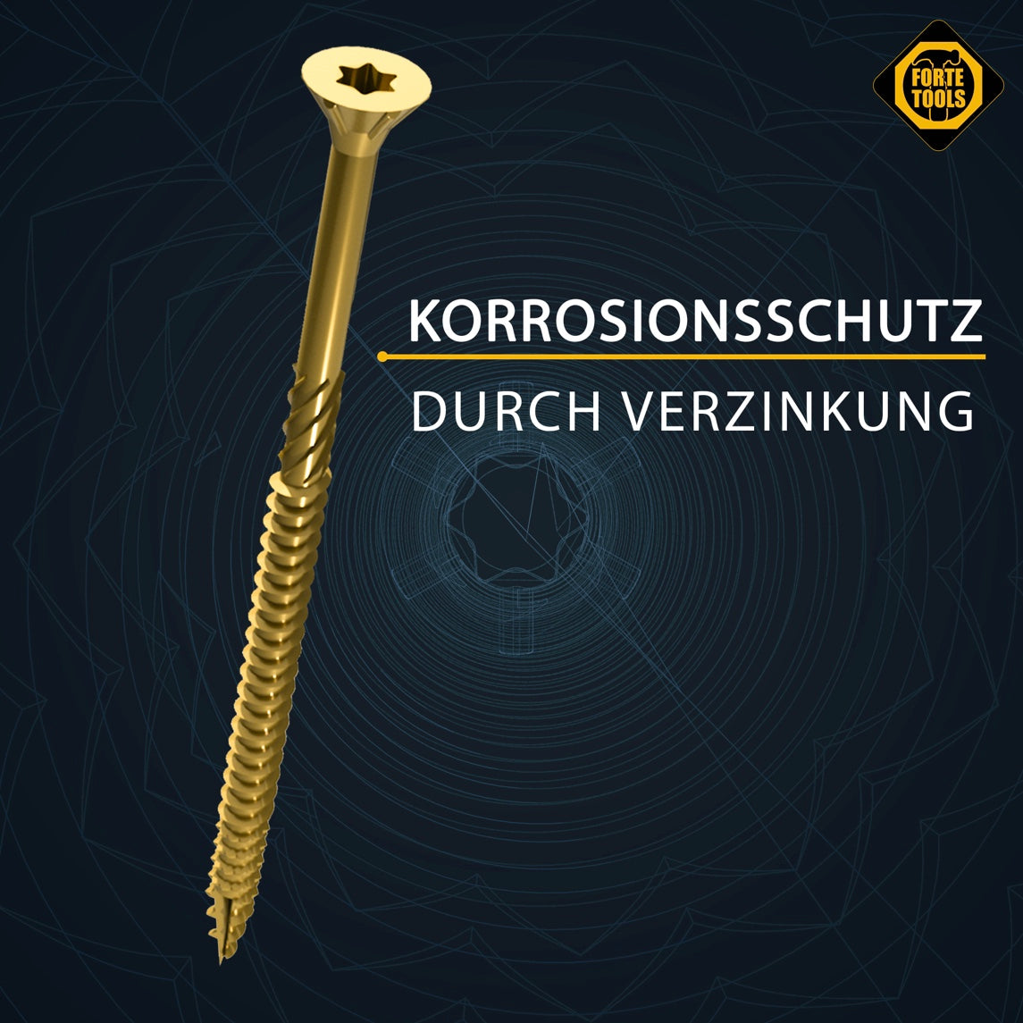Die FORTE Tools Holzschraube mit Torx Aufnahme garantiert dem Anwender eine hohe Flexibilität durch universelle Einsetzbarkeit in Holz. Der Senkkopf sorgt für eine saubere und bündige Versenkung der Schraube in Holz. Die Torx Aufnahme erlaubt eine bessere Kraftübertragung auf die Schraube, höhere Standzeiten sowie ein schnelleres Einfädeln der Schraube mit zugleich besserem Passsitz am Werkstück. Der Reibeteil ermöglicht ein effizienteres einschrauben. Zusätzlich sorgt das Wellenprofil am vorderen Gewinde für ein leichtes und sicheres Verschrauben. Die Verzinkung sorgt für einen Korrosionsschutz und eine deutlich höhere Oberflächenhärte als herkömmliche blanke Schrauben, wodurch sich die Einsatzmöglichkeiten um ein vielfaches im Außenbereich erweitern lassen.