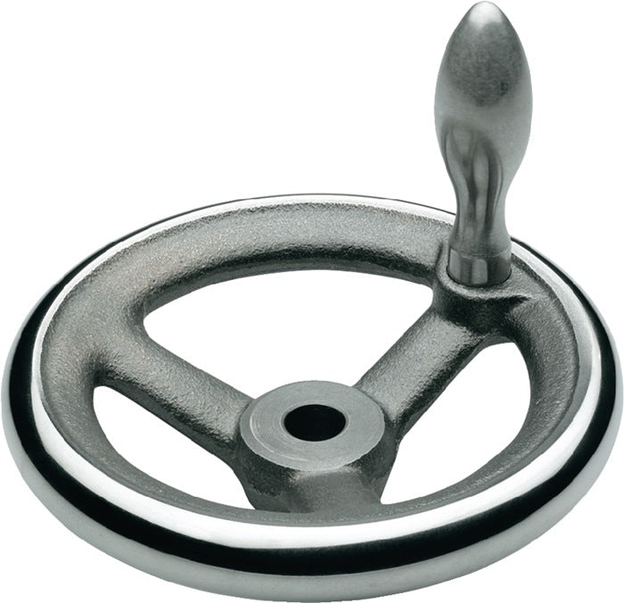 Handräder DIN 950 werden in der Gusseisen-Ausführung mit Ballengriffen aus Stahl versehen · Gusseisen GG · Nabe bearbeitet · Radkranz gedreht und poliert · Rundlauf- und Planlaufabweichung des Radkranzes weitere Ausführungen auf Anfrage