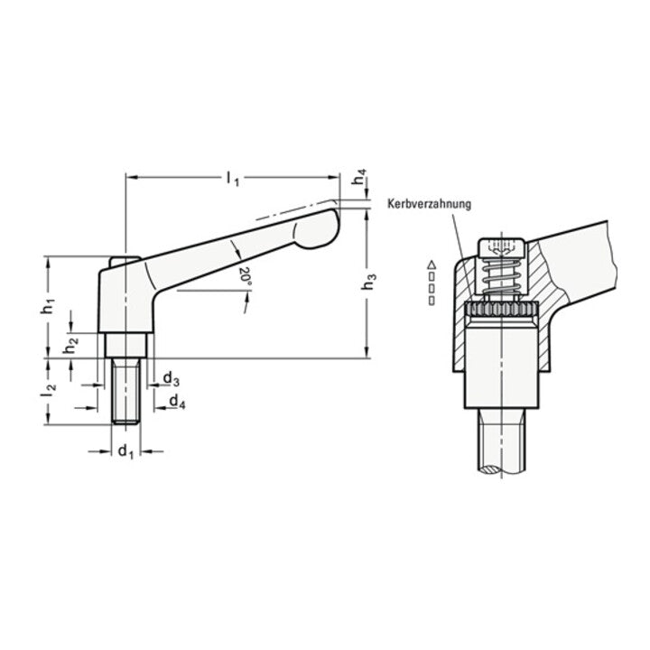 sind vorzugsweise dann einzusetzen, wenn der Spannbereich begrenzt der eine bestimmte Spannstellung erwünscht ist · durch Anheben (Ziehen) des Griffes wird die Kerbverzahnung frei und der Klemmhebel kann in die günstigste Spannposition geschwenkt werden · beim "Loslassen" rastet der Griff selbsttätig wieder ein · Griffkörper · Zink-Druckguss · Gewindebuchse und Halteschraube · Stahl, brüniert weitere Abmessungen und Farbvarianten auf Anfrage
