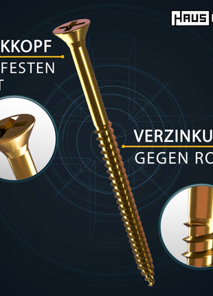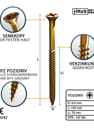 HausHalt Universal Holzbauschraube Holzschraube 6,0 x 140 mm PZ3 100 Stk. ( 000051371217 ) gelb verzinkt Kreuzschlitz Pozidriv Senkkopf Teilgewinde