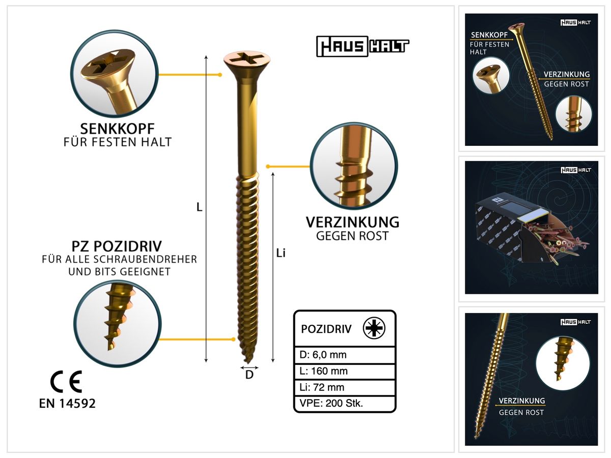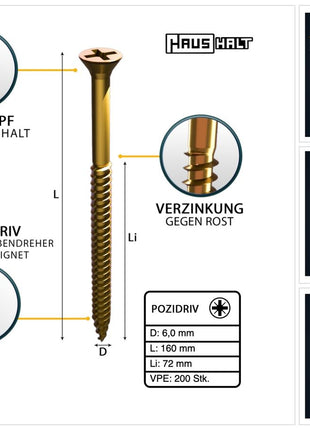 HausHalt Universal Holzbauschraube Holzschraube 6,0 x 160 mm PZ3 200 Stk. ( 2x 000051371220 ) gelb verzinkt Kreuzschlitz Pozidriv Senkkopf Teilgewinde