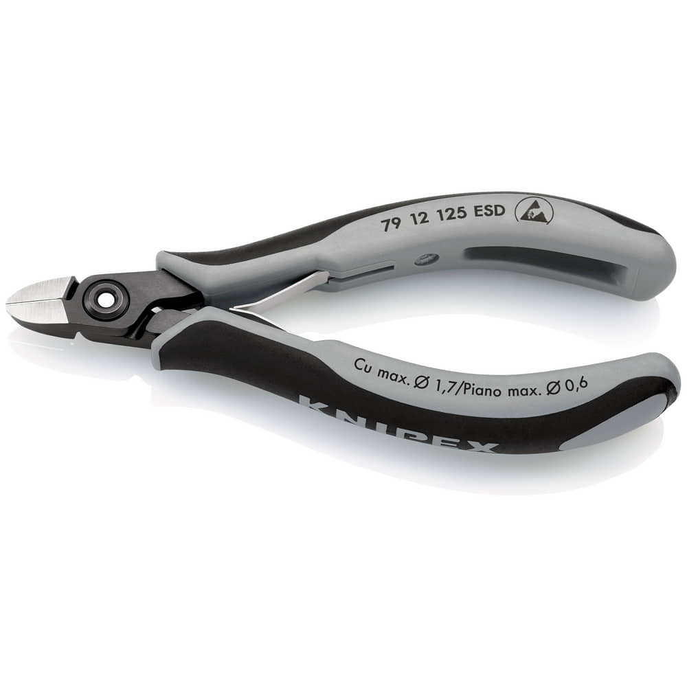 ESD · für feinste Schneidarbeiten z. B. in Elektronik und Feinmechanik · geschliffene, scharfe Schneiden · Schneiden zusätzlich induktiv gehärtet, Schneidenhärte ca. min. 64 HRC · ca. 20% weniger Gewicht · geschraubtes Gelenk · Öffnungsfeder · Chrom-Vanadin-Kugellagerstahl, geschmiedet, mehrstufig ölgehärtet · elektrisch ableitend - dissipativ Zange brüniert · Kopf poliert