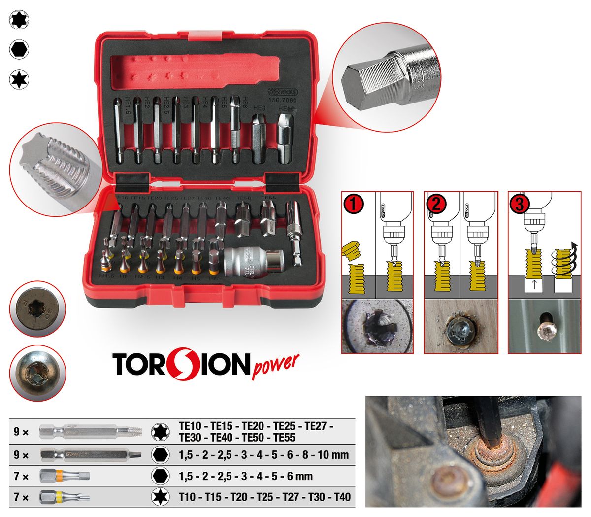 KS TOOLS 1/4" + 10 mm Torx- und Innensechskant-Schrauben-Ausdreher-Satz, 34-tlg ( 150.7060 )