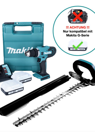 Makita DF 488 DWE Akku Bohrschrauber 18 V 42 Nm G-Serie + Makita UH 522 DZ Akku Heckenschere + 2x Akku 1,5 Ah + Ladegerät + Koffer