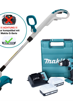 Makita DF 488 DWE Akku Bohrschrauber 18 V 42 Nm G-Serie + Makita UR 180 DZ Akku Rasentrimmer + 2x Akku 1,5 Ah + Ladegerät + Koffer