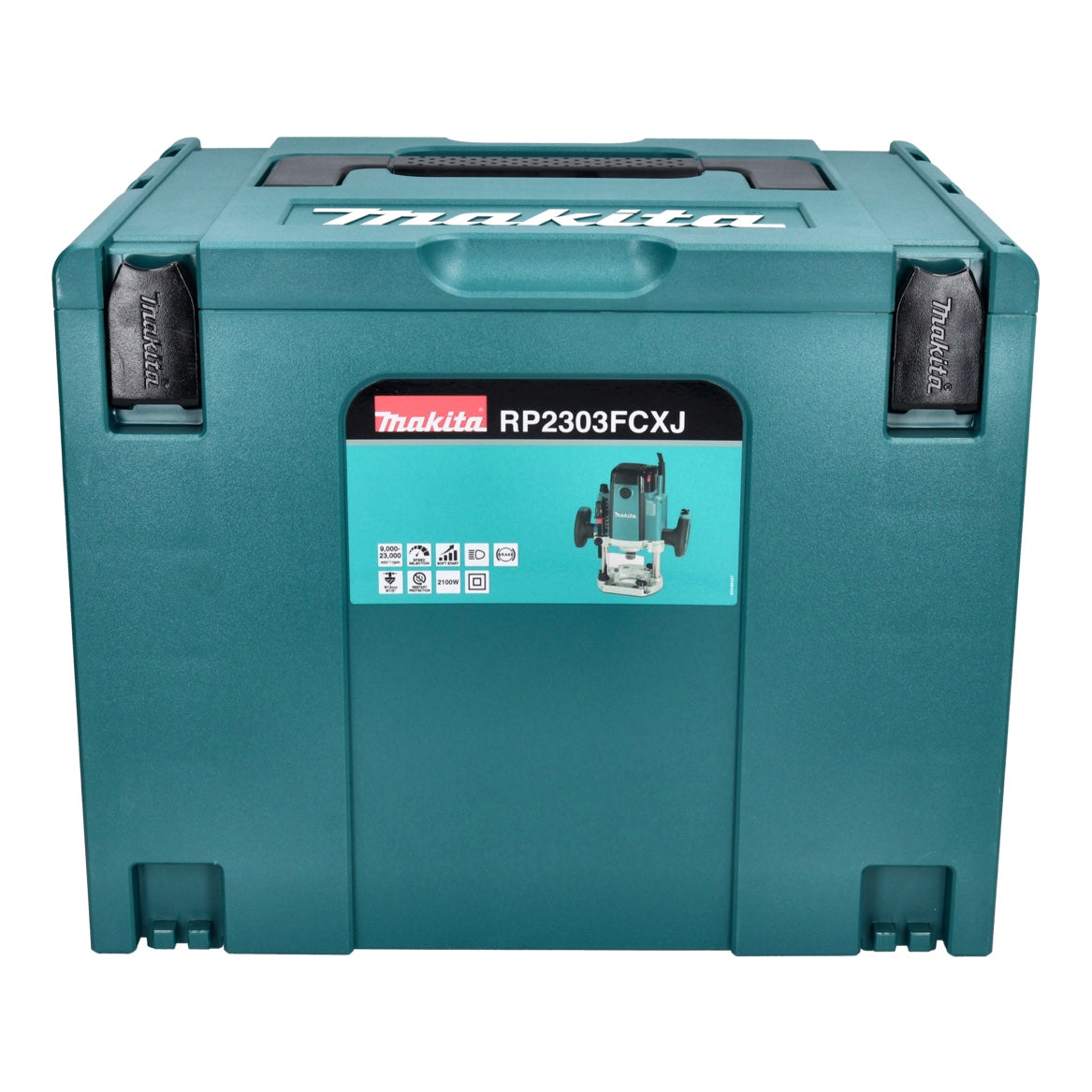 Makita RP 2303 FCXJ Oberfräse 2100 Watt 70 mm Hub + Anschlag + 6 tlg. Fräser Set + Makpac