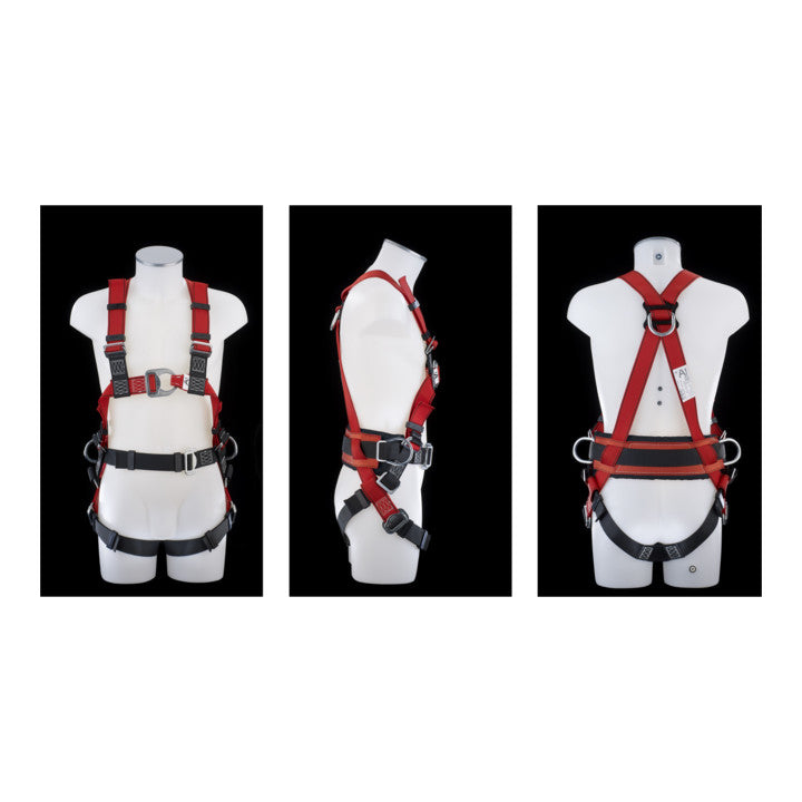 EN 361, EN 358 · mit einem 100/140 mm gepolsterten Rückenteil · zwei Auffangösen (vorn und hinten), sowie zwei seitlichen Positionierungsösen, durch die der Anwender seinen Arbeitsplatz positionieren kann · Verstellungsmöglichkeiten der Schultergurte sowie der Beingurte (mit Durchsteckrahmen) und des Gesäßgurtes · Bauchgurt mit Durchsteckrahmen