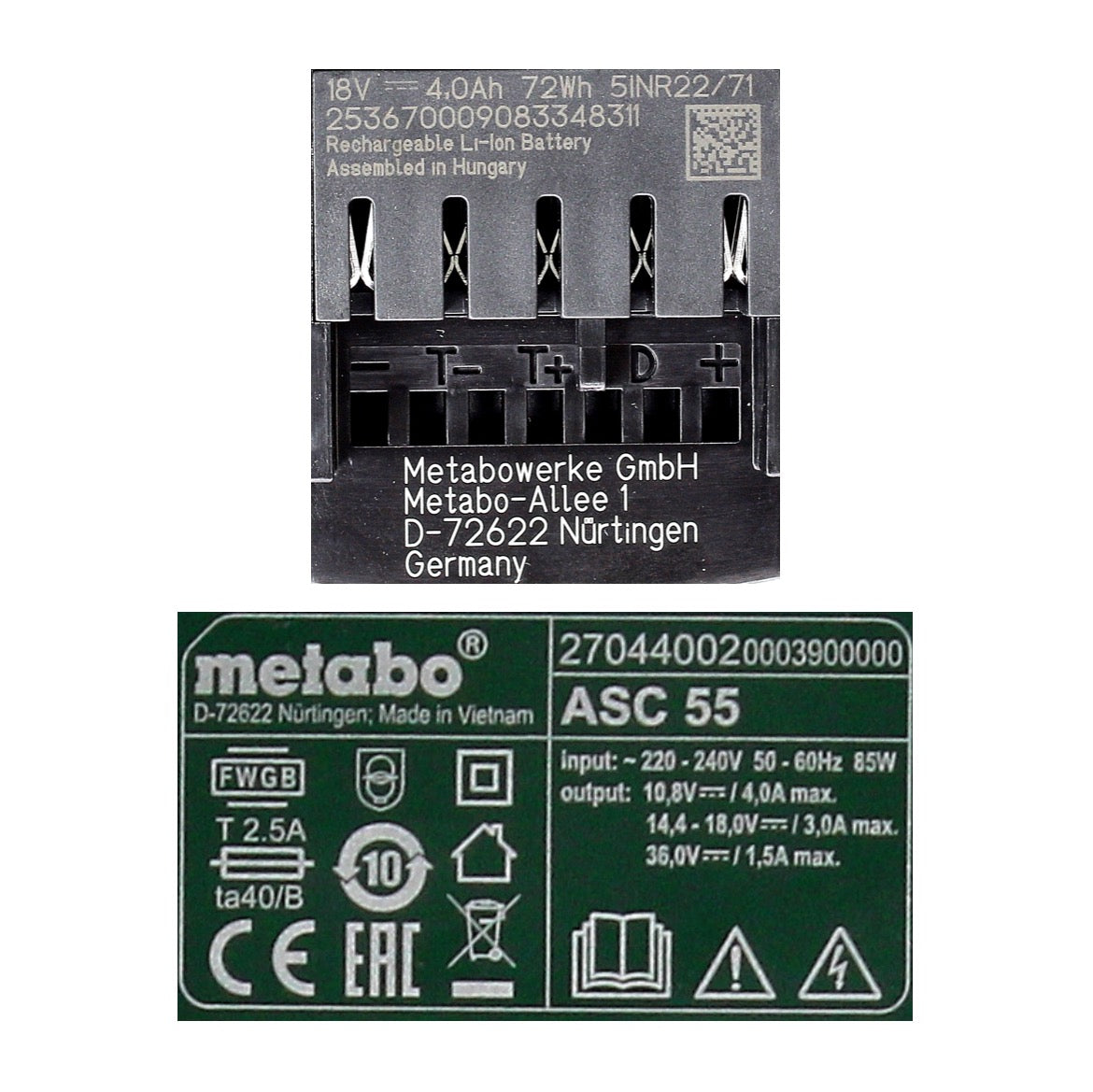 Metabo Akku Basis Set 18V mit 2x Akku LiHD 4,0Ah + Ladegerät ASC 55 ( 685163000 )