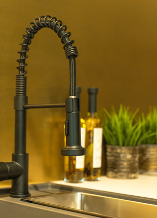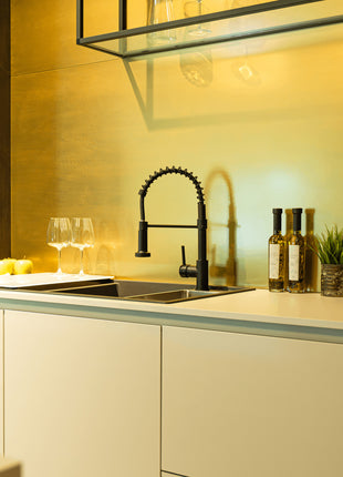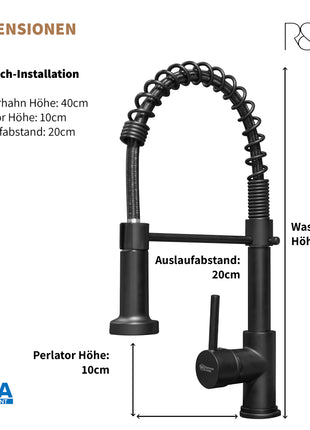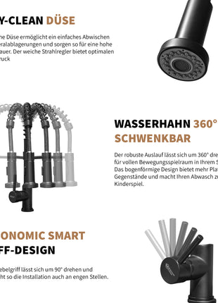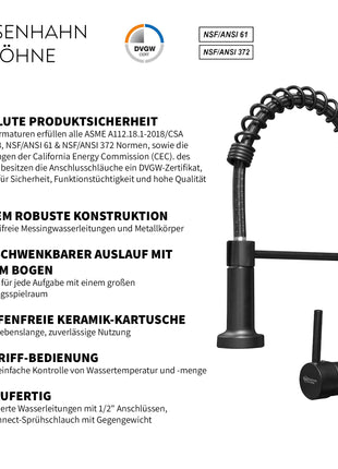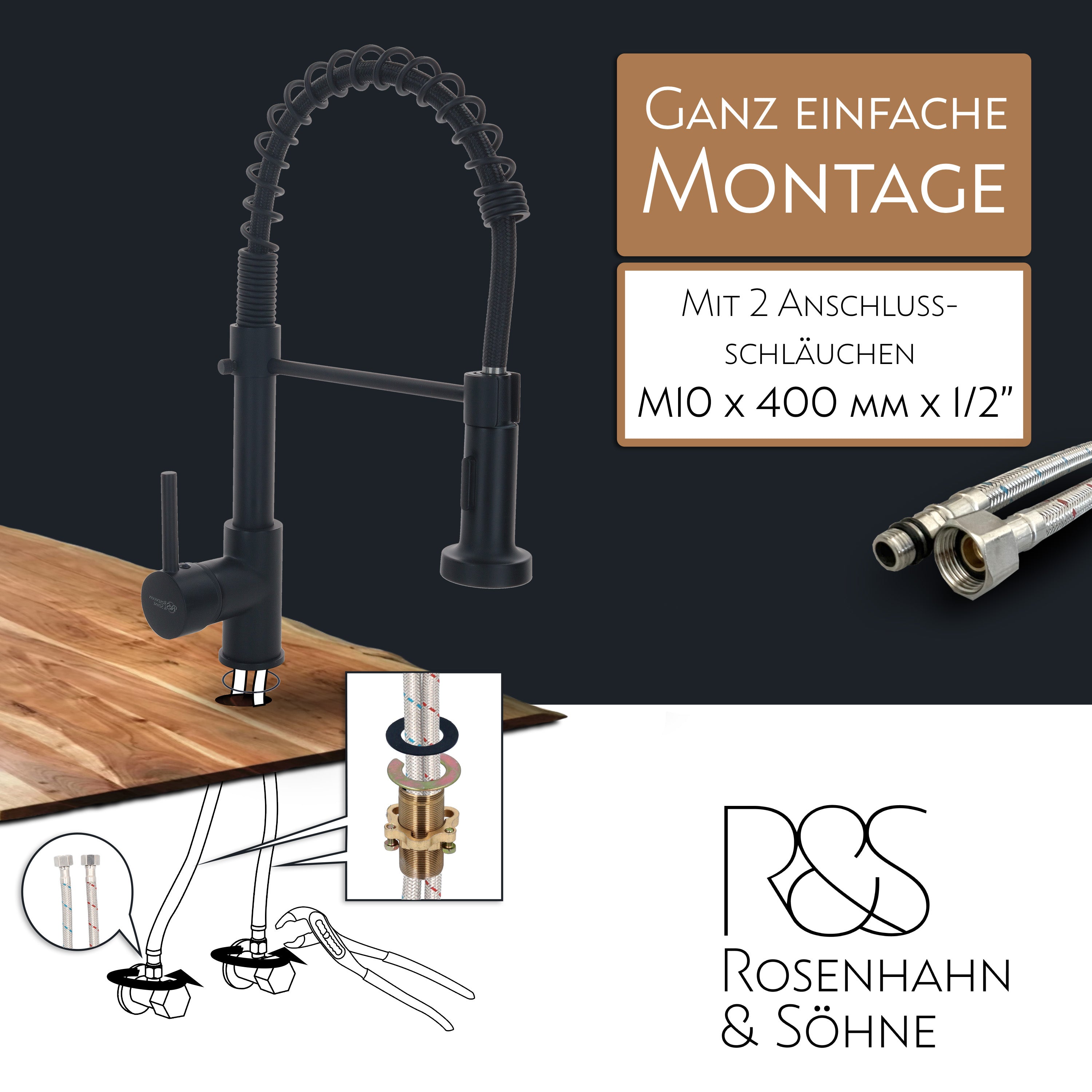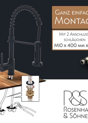 Rosenhahn & Söhne Sylt 200 Küchenarmatur mit Brause- 360° drehbarer Wasserhahn Küche - Armatur Küche schwarz - 2-fach verstellbare Spültischarmatur - Brause & Strahl - Anschlussschläuche