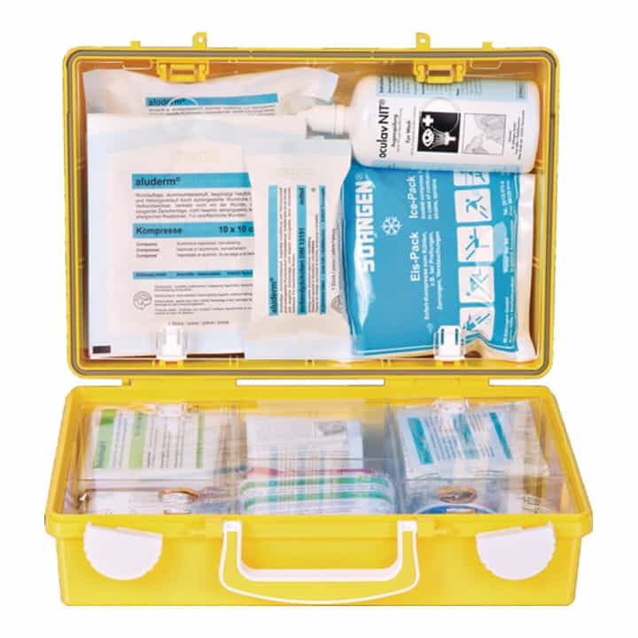 mobil und stationär einsetzbar · leuchtgelb · inkl. Wandhalterung mit 90°-Stopp-Arretierung Dieser Koffer ist nach DIN 13157-2021 - mit Zusatzbefüllung! Zusatzinhalt: u.a. Lederfingerling · oculav NIT® Augenspülung ca. 250 ml · aluderm®-Spezialverbände · Wundreinigungstücher