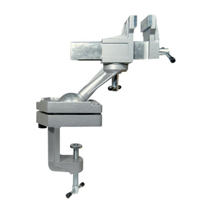 Kleinschraubstock mit Kugelgelenk · durch Spannhebel festklemmbar · um 360° drehbar und 90° wendbar · Schraubstock und Klemmbügel bzw. Anschraubplatte aus Leichtmetall-Legierung · hammerschlaglackiert · verdeckte Stahlspindel · Backen nach vorn öffnend · mit auswechselbaren Kunststoffbacken · Art.-Nr. 4000 830 976 mit Aluminium-Dreh-/ Spannblöcken