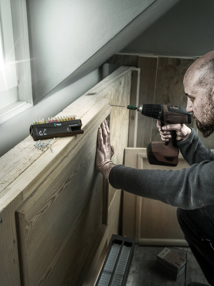 bestückt mit hochwertigen Bits speziell für die Holzanwendung · Bits für Schrauben mit Innen-TORX®-Profil mit Haltefunktion für die Schraube (auch für ASSY®- und SPAX T-STAR plus® Schrauben geeignet*) · die Bits 867/4 TORX® HF halten durch ihre spezielle Geometrie TORX®-Schrauben nach Spezifikation Acument Intellectual Properties sicher auf dem Werkzeug · mit Farbleitsystem · * keine Haltefunktion · Inhalt 1 Schnellwechselhalter mit Ringmagnet (Rapidaptor Technologie) (L. 57 mm) Bits (mit Torsions-Zone extrahart) für Schrauben mit Kreuzschlitz (PH), Gr. 2 / 2 / 3* Bits (mit Torsions-Zone extrahart) für Schrauben mit Kreuzschlitz (PZD), Gr. 1 / 1 / 1 / 2 / 2 / 2 / 2 / 2 / 2 / 3 / 3* Bits mit Haltefunktion für Schrauben mit Innen-TORX®-Profil Gr. T 10 / 10 / 15 / 15 / 20 / 20 / 20 / 20 / 25 / 25 / 25 / 25 / 30 / 30 / 40* TX 40 ohne Farbleitsystem * Länge 25 mm Die Wera Bits 867 TX® HF sind auch passend für Würth ASSY® Schrauben sowie Altenloh SPAX T-STAR plus® Schrauben