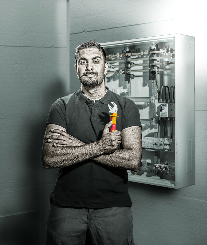 verstellbar · selbstjustierend · zugreifend · ratschend · mit Abgleitschutz · VDE-isoliert bis 1000-V · gefertigt gem. IEC 60900 · stückgeprüft Besondere Produktvorteile:  automatisch stufenlos zugreifend · schraubenschonend (glatte Backen) · Ratschenfunktion (durchgängiges Schrauben ohne Absetzen) · kleiner Rückschwenkwinkel von nur 30°