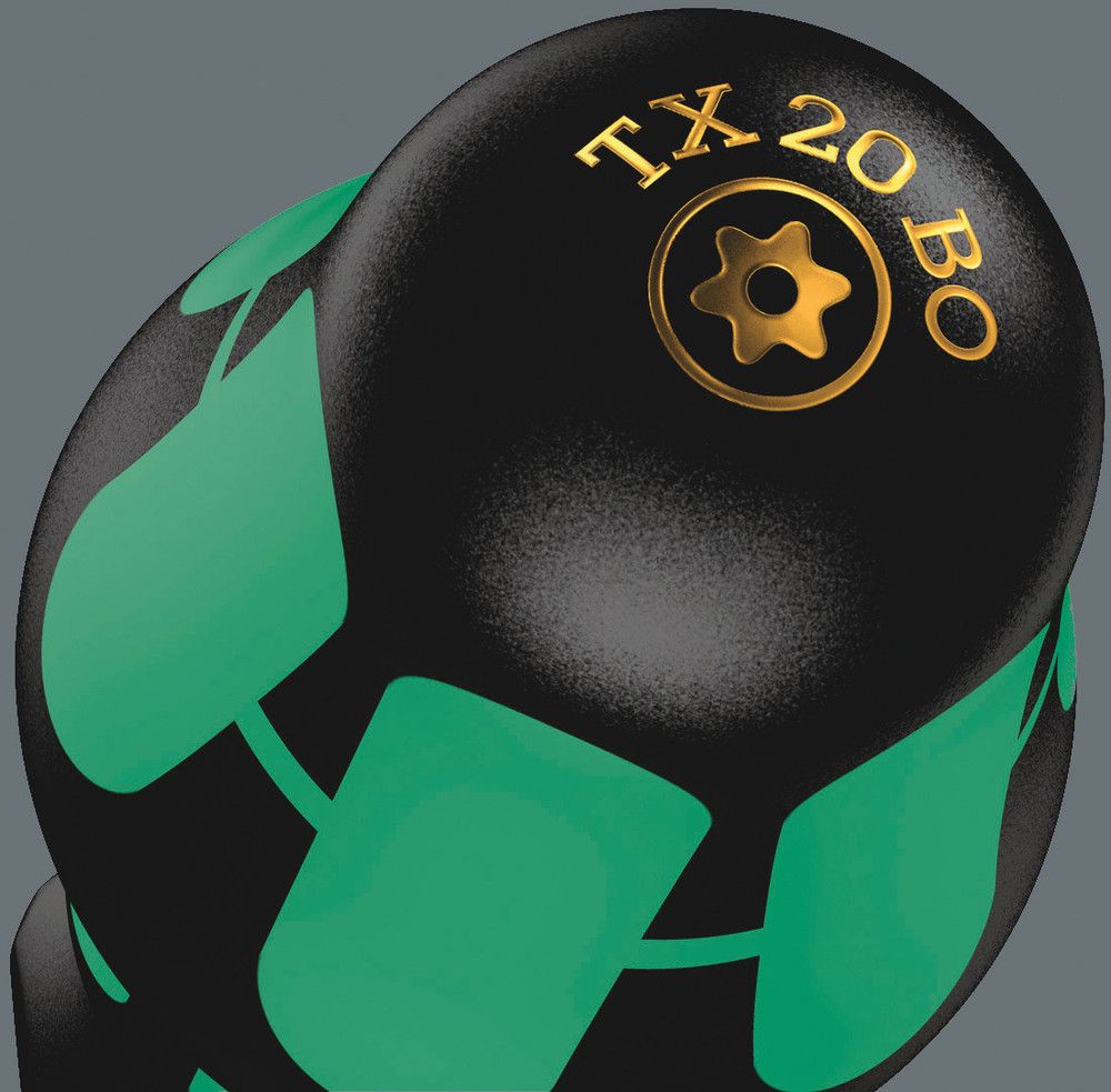mit Mehrkomponenten-Kraftform-Griff mit Abrollschutz · Klinge aus legiertem Werkzeugstahl mit BlackPoint-Spitze · mit Bohrung im Torx®-Profil (auch mit Sicherungsstift) · Größenleitsystem · Take it easy Tool Finder System · für Schrauben mit Innen-TORX®-Profil (auch mit Sicherungsstift)