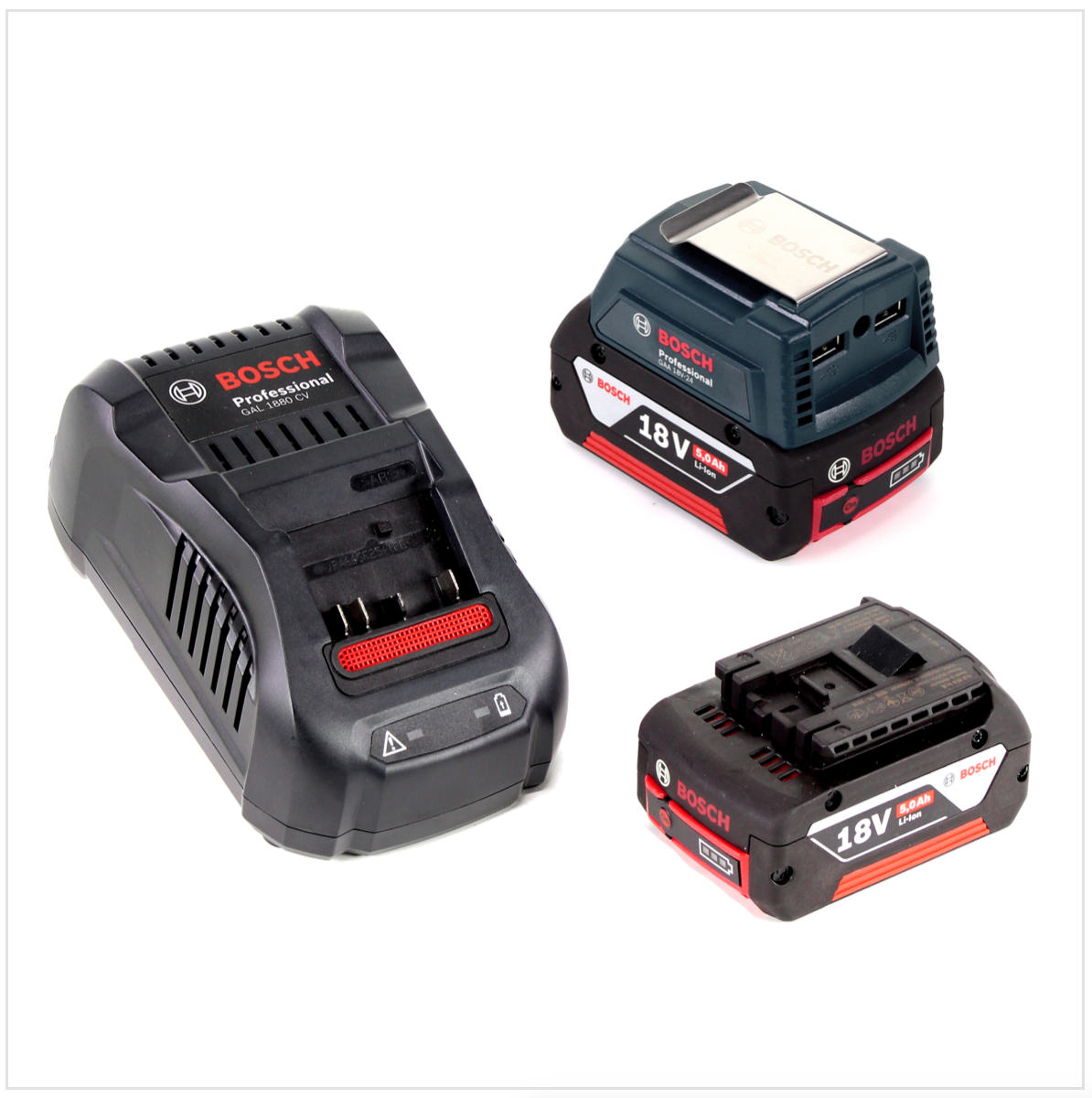 Bosch USB Power Set 18 V mit GAA Professional USB Adapter für 14,4 V / 18 V Akkus + 2x GBA 18V 5,0 Ah Li-Ion Einschub Akku + 1x Schnell Ladegerät GAL 1880 CV