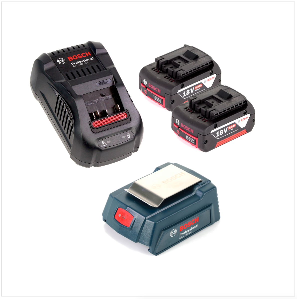 Bosch USB Power Set 18 V mit GAA Professional USB Adapter für 14,4 V / 18 V Akkus + 2x GBA 18V 6,0 Ah Li-Ion Einschub Akku + 1x Schnell Ladegerät GAL 1880 CV