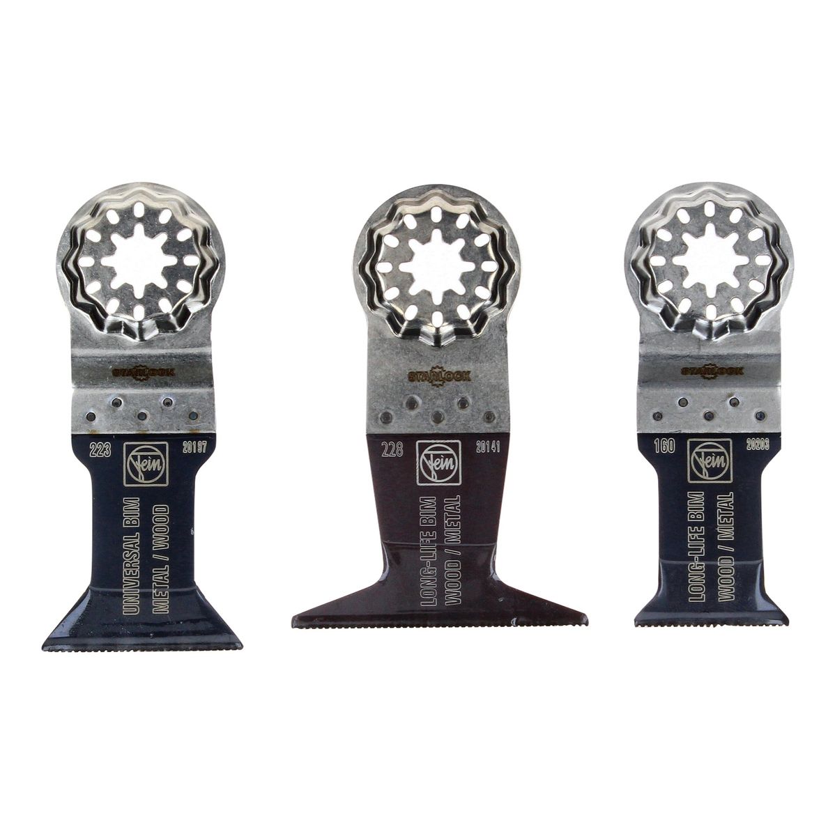 Der handgeführte Oszillierer von FEIN eignet sich zum Schleifen kleiner Flächen, Ecken und Kanten, zum Sägen von dünnen Blechen, Holz- und Kunststoffteilen, zum Schaben, Polieren, Raspeln, Schneiden und Trennen mit den zugelassenen Einsatzwerkzeugen und Zubehör. Mit dem MultiMaster MM 300 PLUS START als Kabel-Variante haben Sie drei Sägeblätter im Lieferumfang womit Sie grundlegende Sägearbeiten erledigen können. Mit einer Kabellänge fünf Metern werden Renovierungen, Reparaturen und Aufarbeitungsarbeiten effektiv und schnell erledigt. Die Starlock Plus Aufnahme mit dem werkzeuglosen QuickIn Schnellspannsystem ermöglicht einen schnellen und einhändigen Werkzeugwechsel und direkte Kraftübertragung. Angetrieben wird das Gerät durch einen leistungsstarken 250 Watt Motor, welcher mit hohem Kupferanteil eine höhere Schnittgeschwindigkeit und einen schnelleren Arbeitsfortschritt erzielt. Er ist selbsttragend in dem Gerät montiert für eine hervorragende Geräusch- und Vibrationsreduzierung. Die Drehzahl/ Schwingzahl ist stufenlos einstellbar, um ein optimales Arbeitsergebnis zu erreichen. Die Griffläche ist mit einer rutschfesten Softgrip Beschichtung verkleidet. Das mitgelieferte FEIN Schleifset enthält eine Dreiecks-Schleifplatte mit einer Kantenlänge von 130 mm und drei verschiedene Schleifblätter in jeweils doppelter Ausführung (K 60, K 80, K 180). Die Kunststoff-Trägerplatte dient zur Vermeidung von Beschädigungen und Markierungen auf dem Werkstück. Das Schleifset ist ideal einsetzbar zum wirtschaftlichen Schleifen von Rand- und Eckbereichen, sowie mittleren Flächen. Das Set verspricht keinen Rückschlageffekt an Kanten, sowie eine einfache Handhabung und sehr gute Abtragsleistung. Durch die Starlock Plus Aufnahme passt das Set an viele verschiedene Maschinen und lässt sich werkzeuglos montieren.