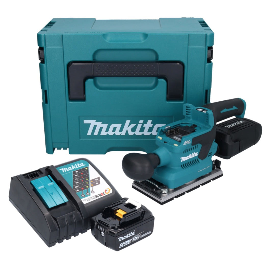 Makita DBO 381 RT1JU Akku Schwingschleifer 18 V 93 x 185 mm Brushless + 1x Akku 5,0 Ah + Ladegerät + Makpac