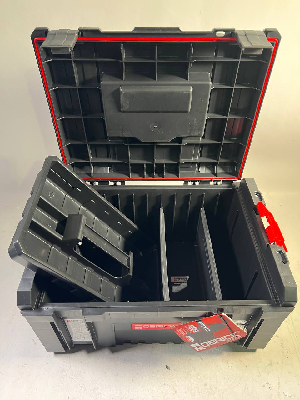 Die Qbrick System PRO Toolbox ist eine geräumige, modulare Werkzeugbox, die bereits standardmäßig eine breite Palette an Zubehör bietet: eine im Deckel integrierte flexible Dichtung, die eine hohe Beständigkeit gegen das Eindringen von Staub und Wasser gewährleistet, 3 verstellbare Fächer, eine geräumige Ablage sowie seitliche Verbindungs- und Befestigungselemente aus super strapazierfähigem Polyamid vorne. Spezielle Führungen in der QS PRO Toolbox ermöglichen es Ihnen, die QS TWO Multi Organizer zu platzieren, die der Aufbewahrung von kleinem Werkstattzubehör dienen.