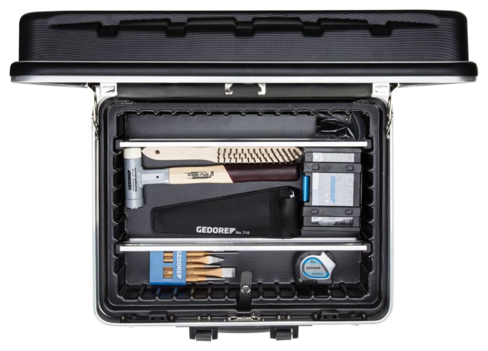 mit universeller Bestückung · mit Werkzeugen in Handwerker und Industriequalität Bestehend aus: je 1 Ring-Maulschlüssel SW 10 / 13 / 17 / 19 / 22 mm (7) je 1 Winkelschraubendrehersatz 8-tlg. 2 - 10 mm (PH 42-88) 1 Rollgabelschlüssel 200 mm, Arbeitsbereich max. 25 mm (60 P 8) je 1 Schraubendreher für Schlitzschrauben Gr. 3 / 4 / 5,5 / 6,5 / 8 mm (2150) je 1 Schraubendreher für Schrauben mit Kreuzschlitz (PH) Gr. 0 / 1 / 2 (2160) 1 Schon- und Schlosserhammer rückschlagfrei KOMBI-PLUS R (247 H-30) 1 Taschen-Messschieber, Meßbereich 140 mm (710) 1 Stahlbandmaß, Band-L. 3 m (4534-3) 1 einpoliger Spannungsprüfer 3,0 x 60 mm, Arbeitsbereich 220 - 250 V AC (4615 3) 1 Abisolierzange 160 mm 2K-Griff (8098-160 JC) 1 Mehrfachzange 200 mm 2K-Griff (8133-200 JC) 1 Kraft-Kombinationszange 180 mm 2K-Griff (8250-180 JC) 1 Kraft-Seitenschneider 160 mm 2K-Griff (8316-160 JC) 1 Wasserpumpenzange L. 255 mm, Arbeitsbereich max. 38 mm (142 10 JC) 1 Kabelmesser Klingen-L.90 mm (0513-09) 1 Drahtbürste 3-reihig (644) 1 Schlagwerkzeugsatz, 6-tlg. (106) bestehend aus: Flachmeissel, 8-kant, Länge 125 mm (97-125) Flachmeissel, 8-kant, Länge 150 mm (97-150) Kreuzmeissel, 8-kant, Länge 150 mm (98-125) Durchtreiber, 8-kant, Kopf-Ø 3 mm (99 12-3) Körner, 8-kant, (100-10) Splintentreiber, 4 mm, (119-4) 1 6,3 mm (1/4”) Bit-Steckschlüsselbox, mit Knarre 35-tlg. (666-U-20) bestehende aus: je 1 Kraft-Steckschlüsseleinsatz 6,3 mm (1/4”) Gr. 4 / 5 / 5,5 / 6 / 7 / 8 / 9 / 10 / 11 / 12 / 13 mm je 1 Bit mit 6,3 mm (1/4”) Sechskantantrieb für Schrauben mit Innensechskant-Profil Gr. 4 / 5 / 6 / 8 mm für Schrauben mit Innen-TORX®-Profil Gr. T 10 / 15 / 20 / 25 / 27 / 30 / 40 für Schrauben mit Kreuzschlitz (PH) Gr. 1 / 2 / 3 für Schrauben mit Kreuzschlitz (PZD) Gr. 1 / 2 / 3 für Schlitzschrauben Gr. 4,5 / 5,5 / 6,5 mm Kardanverlängerung 6,3 mm (1/4”) Länge 50 mm 1 Bitadapter 6,3 mm (1/4”)-Außenvierkant auf 6,3 mm (1/4”)-Innensechskant 1 Adapter 6,3 mm (1/4”)-Außensechskant auf 6,3 mm ( 1/4”)-Außenvierkant 1 Umschaltknarre 6,3 mm (1/4”) (2093 U-20) Schalenkoffer: max. Zuladung 30 kg, umlaufender Aluminiumrahmen, 2 Metall-Kippschlösser und ein 3-stelliges Zahlencodeschloss Außenmaße: 395 x 490 x 185 mm (L x B x H)