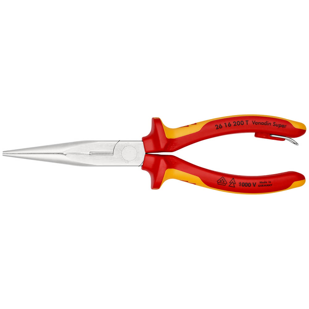 mit Schneide (Storchenschnabelzange) · VDE-isoliert bis 1000 V · gefertigt gem. DIN EN/IEC 60900, stückgeprüft · gerade, flachrunde, lange, spitz zulaufende Backen · Greifflächen gezahnt · verwindungstolerante, elastische Präzisionsspitzen · Schneiden zusätzlich gehärtet, Schneidenhärte ca. 61 HRC · Vanadin-Elektrostahl, geschmiedet, mehrstufig ölgehärtet Zange verchromt mit integrierter isolierter Befestigungsöse zum Anbringen einer Absturzsicherung