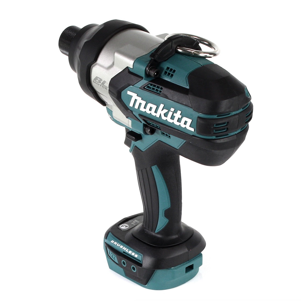 Dieser akkubetriebene Schlagschrauber aus dem Hause Makita eignet sich hervorragend zum Anziehen von Schrauben und Muttern, zum Beispiel beim Reifenwechsel. Das Gerät kann man auch zum Bohren in Holz verwenden. Der Ring ist nützlich, um das Werkzeug mit einem Hebezeug aufzuhängen. Zuerst das Seil durch den Ring führen. Dann das Werkzeug mit dem Hebezeug aufhängen. Die Dreh- und Schlagzahl ist in 3 Stufen regelbar. Der bürstenlose Motor sorgt für mehr Ausdauer, eine längere Lebenszeit und eine kompaktere Bauweise. Die     spezielle Konstruktion mit eingebauten Gummidämpfern schützt Akku und Kontakte vor Vibrationen. Dieser kraftvolle Akku-Schlagschrauber hat weiterhin eine eingebaute leuchtstarke Doppel-LED mit Nachglimmfunktion, sodass auch das Arbeiten im Dunkeln unproblematisch ist. Eine elektronische Motorbremse ist auch vorhanden.