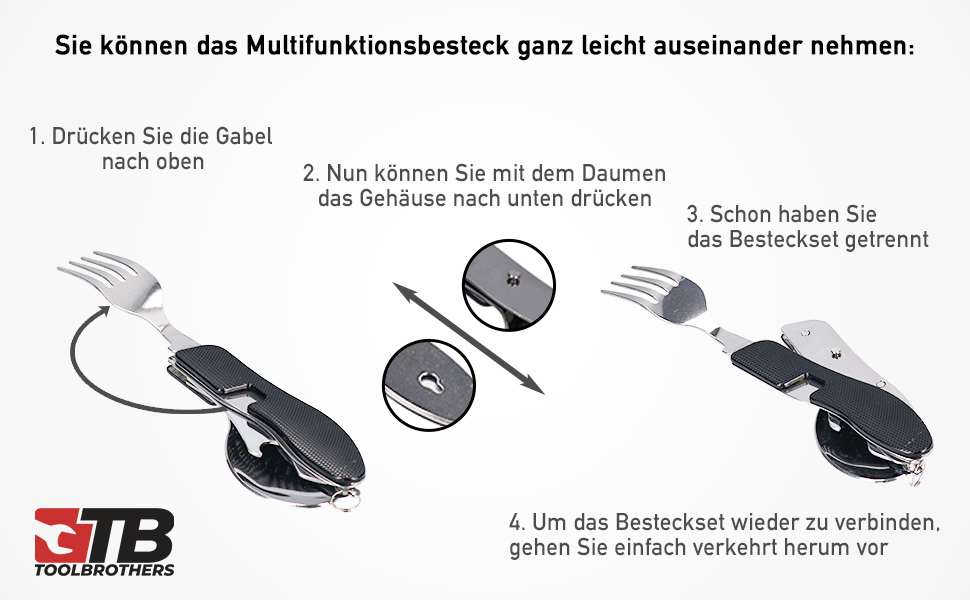 - 1x Toolbrothers 4 in 1 Multifunktions - Besteck Set in schwarz aus Löffel, Messer, Gabel, Flaschenöffner Campingausrüstung, faltbar, leicht zu reinigen
