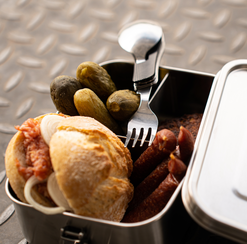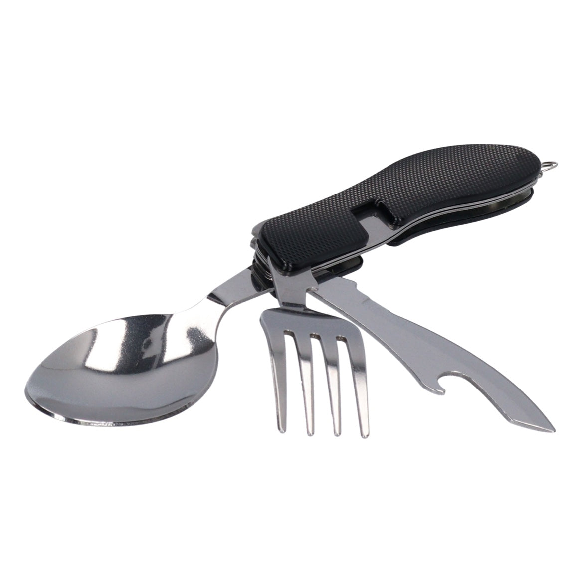 Mit diesem 4 in 1 Multifunktions - Besteck bleibt kein Hunger offen. Ob Löffel, Messer, Gabel oder Flaschenöffner, man hat alles an einem Tool dabei.